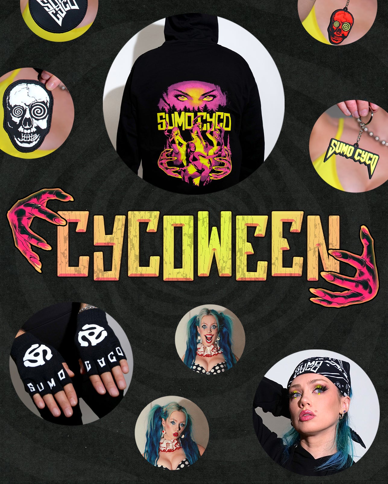 Welcome to spooky month at sumocyco.com! We are dropping band new super comfy FIRE KEEPER hoodie with matching limited screen printed poster. Each one is numbered 1 of 50 with slight original variations! We've also got classic branded bandanas, 3 new patches and two rubber keychains! Don't forget the Clown double sided poster with a sexy and scary side! Matt's new 45-RPM adaptor hand tattoos gave us inspo for an update on the fav favorite fingerless gloves.